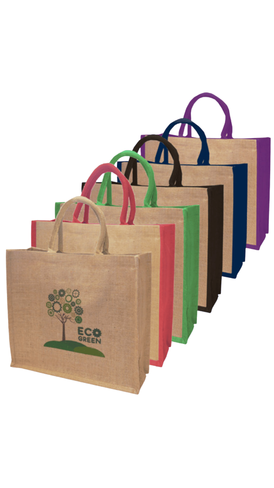 Elegant and durable jute tote bags designed for retail, grocery, and promotional use. These finished goods offer a premium, eco-friendly canvas for branding. Available with inner lamination and various handle options.